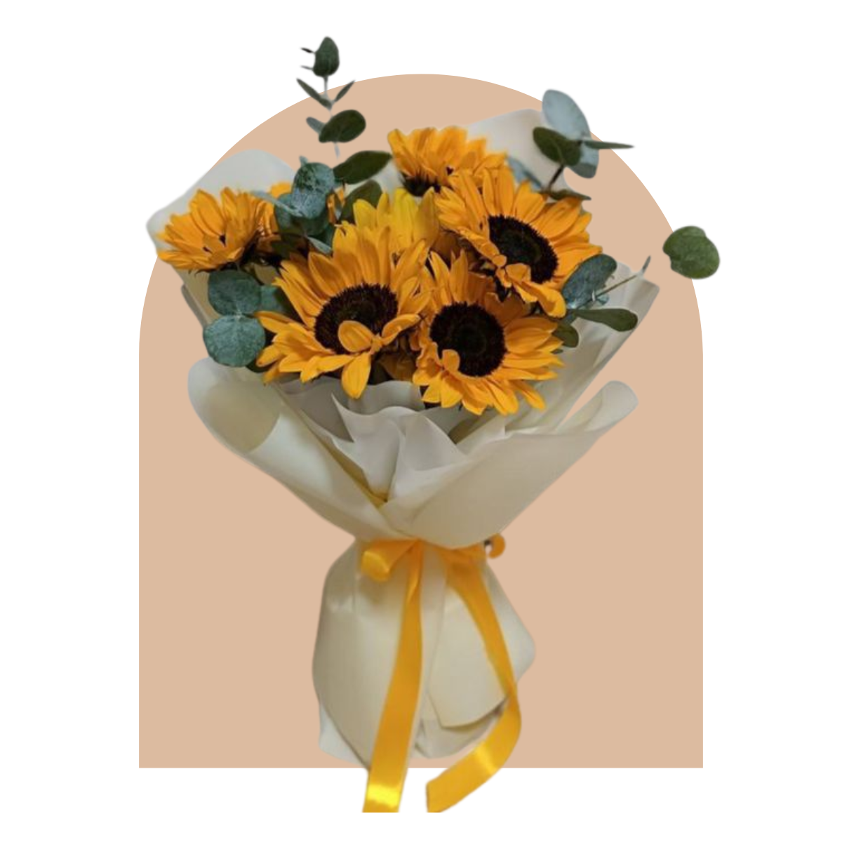 Composición floral de 6 girasoles y eucalipto chino (baby blue) con papel impermeable importado, listón satinado.