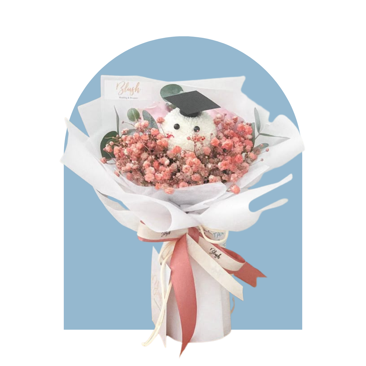 Composición floral de milenio y pompón acompañado de birrete