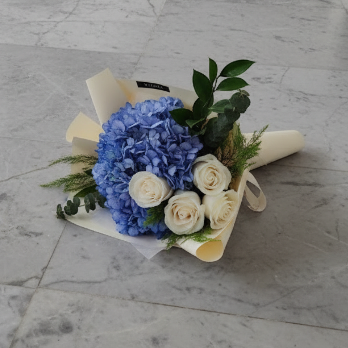 Hortensia Azul, Ruscus, rosas blancas, eucalipto chino, esparragos