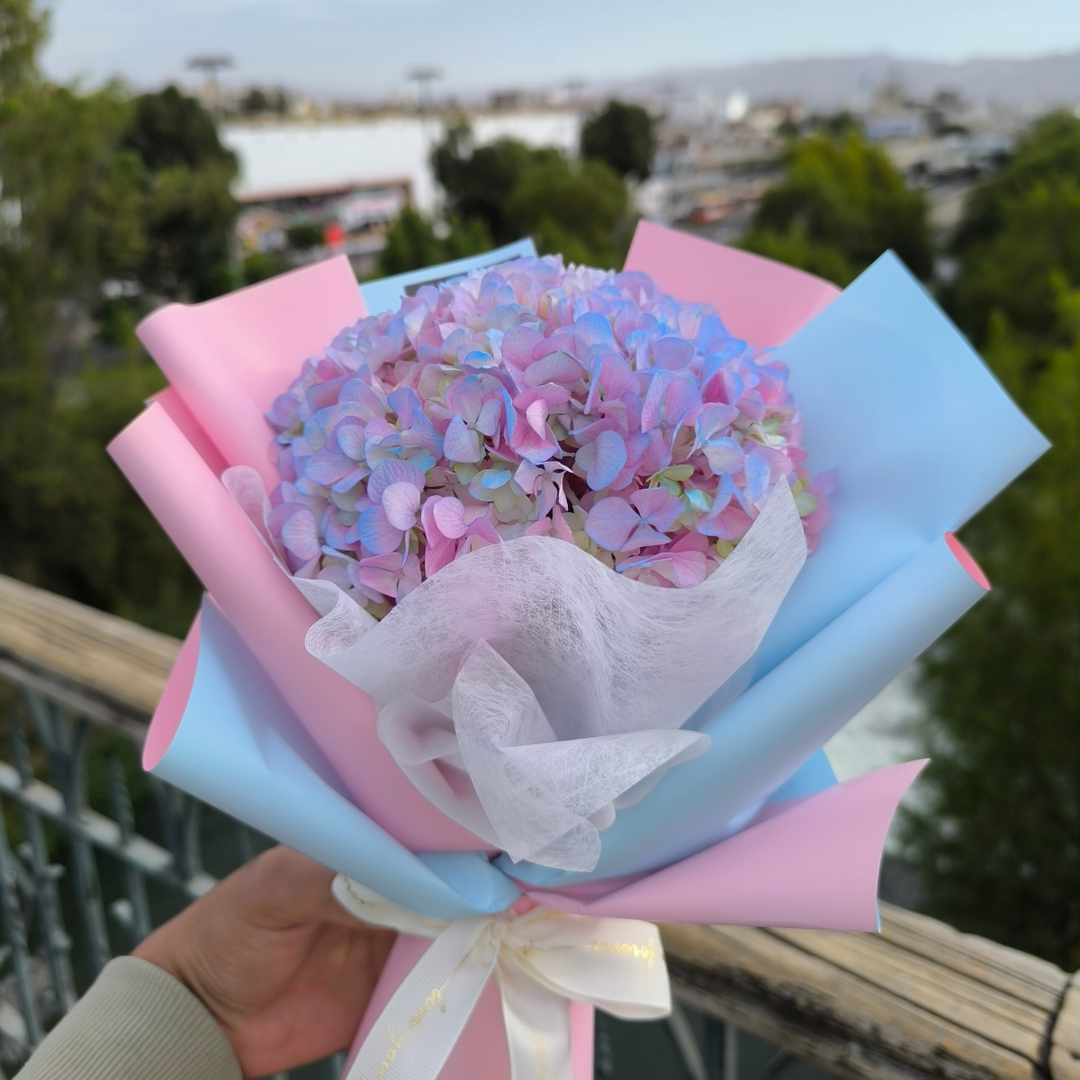 Composición floral de hortencia rosada con difuminado azul, papel coreano rosa y azul.