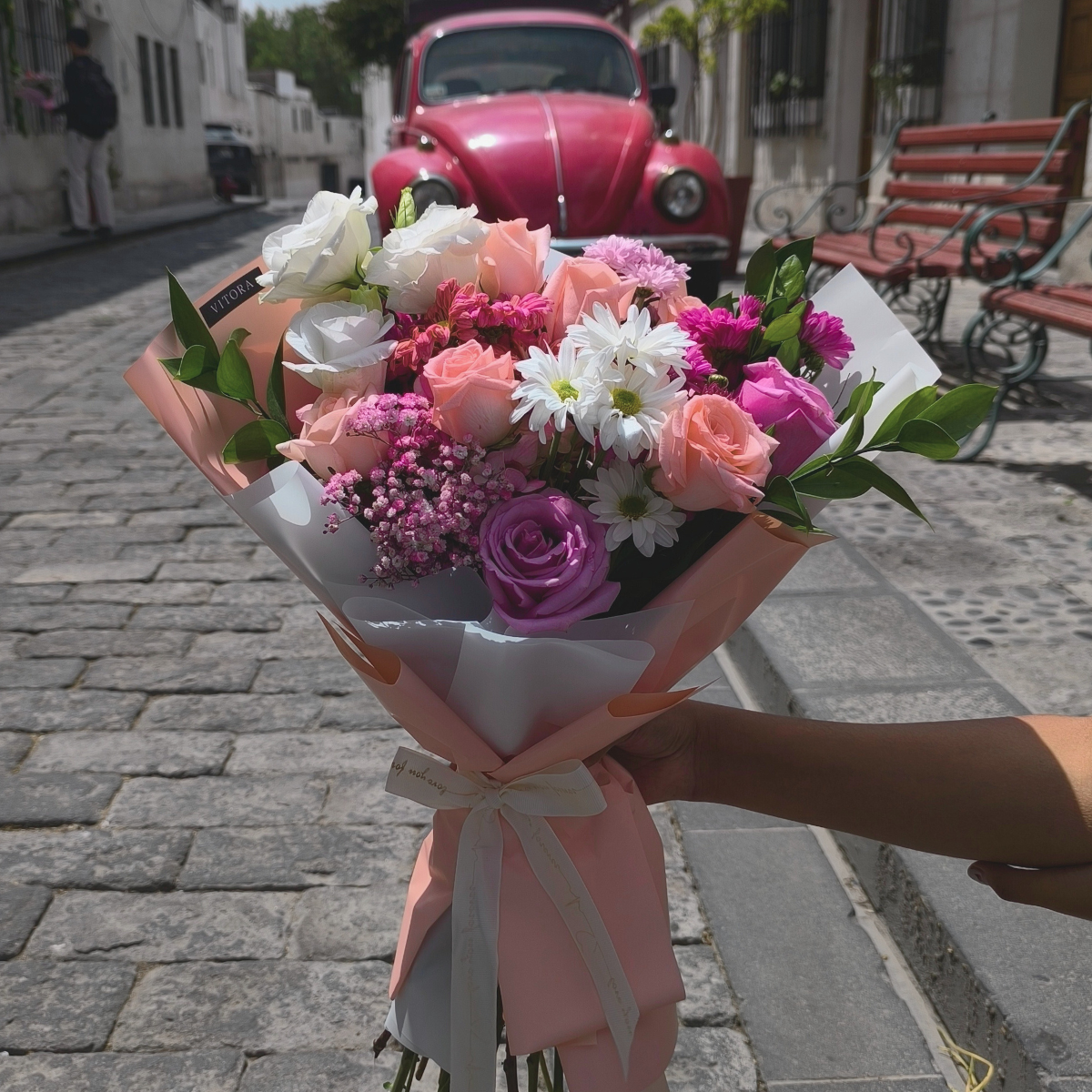 Ramo de rosas, margaritas, lisianthus, ruscus, gypso rosada