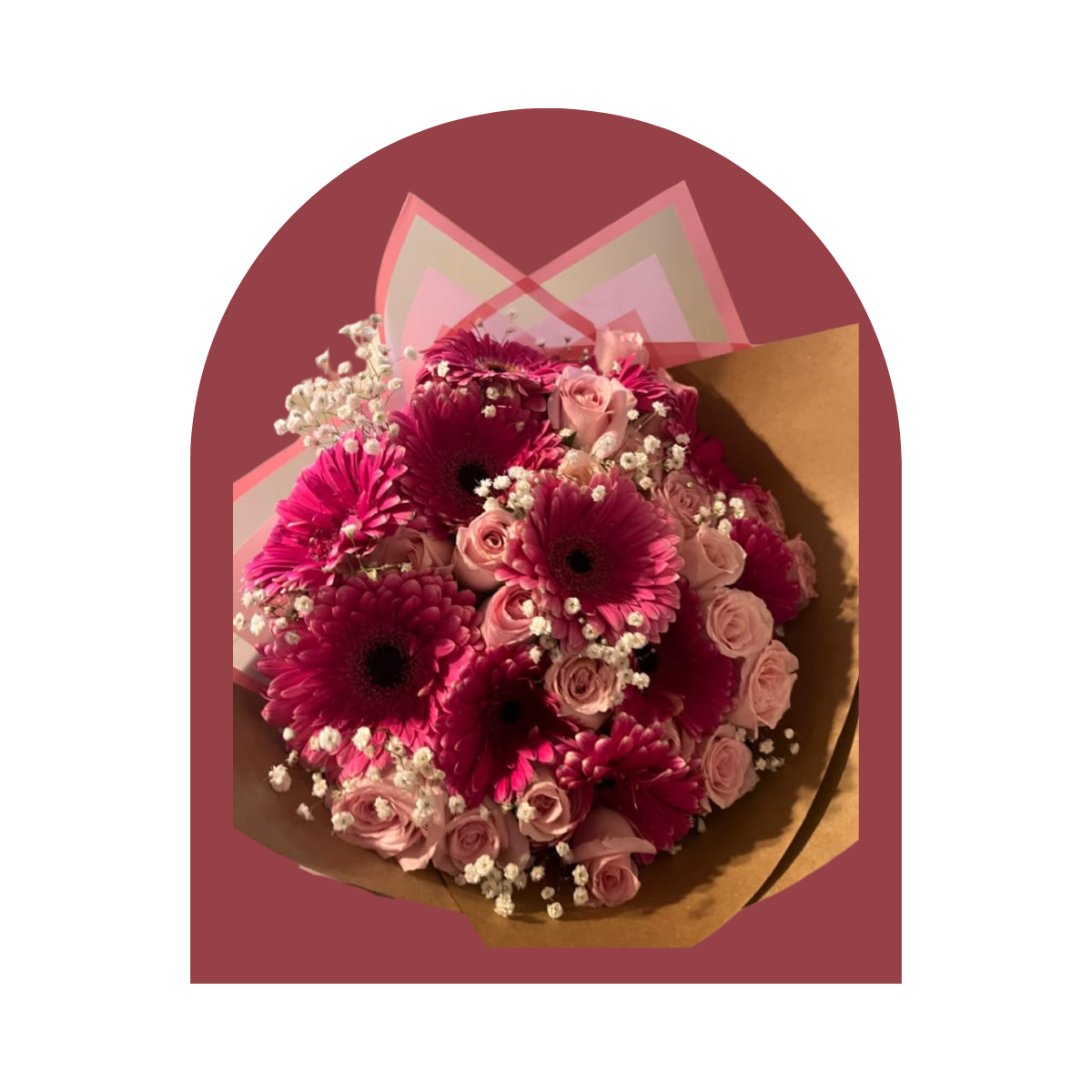 Composición floral de gerberas, minirosas acompañado de follaje a disposición