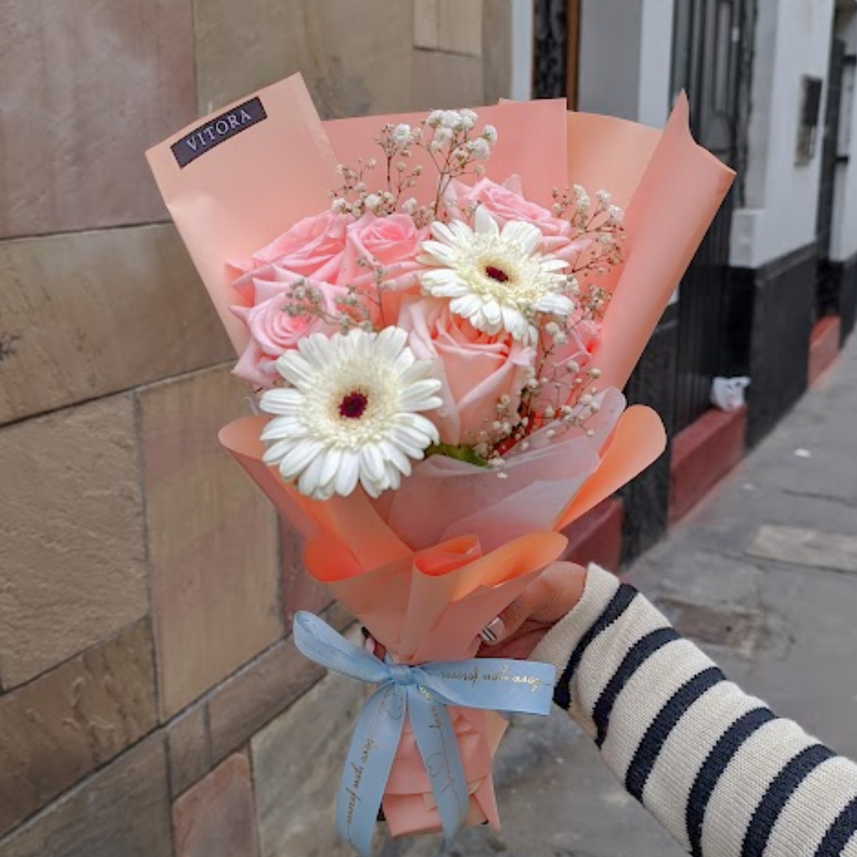 Composición floral de rosas (6) rosadas, gypso y espárragos